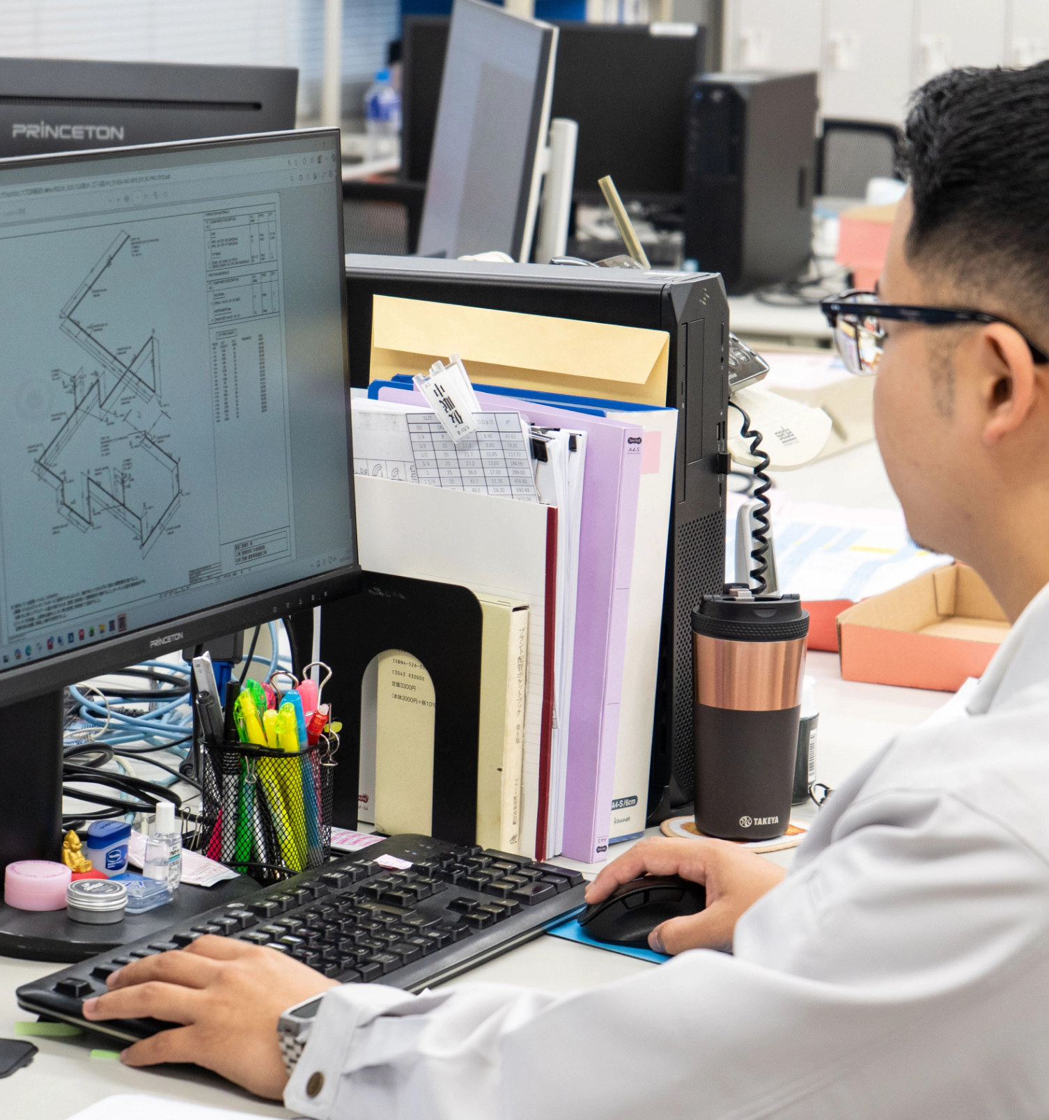 とはいえ、まだ2年目なので、いまはCADオペレーター的な作業が主です。配管ルートを自分で考えて図面をまとめるというよりは、先輩が描いた計画を形にするサポートの役割が多いですね。でも、先輩たちが「自分が設計したものが実際に現場で稼働しているのを見る瞬間こそやりがい」と言うのを聞いて、私もいつかはそこに到達したいと思っています。 また、「社長になりたい」と言うのは口先だけではなく、行動でも示さなければいけません。まだまだ若いですし、経験不足ですが、会社全体をもっと良くしていくための視点を持って仕事に取り組みたいと考えています